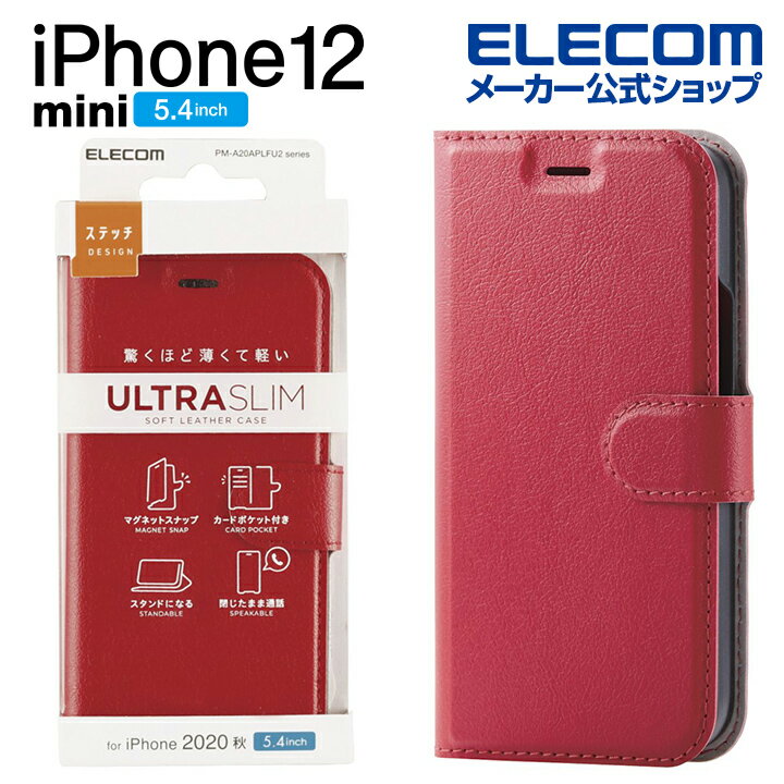 エレコム iPhone 12 mini 用 レザー ケース UltraSlim ステッチ 手帳型 アイフォン 12 ミニ 新型 iPhone12 mini iPhone 2020 5.4 インチ レザー ケース カバー 薄型 磁石付き レッド PM-A20APLFU2RD