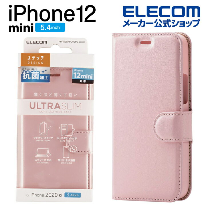 エレコム iPhone 12 mini 用 iPhone 12 mini レザー ケース UltraSlim 磁石付き ステッチ 抗菌 手帳型 アイフォン 12 ミニ レザーケース 手帳型 UltraSlim 薄型 磁石付き ステッチ 抗菌 ピンク PM-A20APLFUPVPN